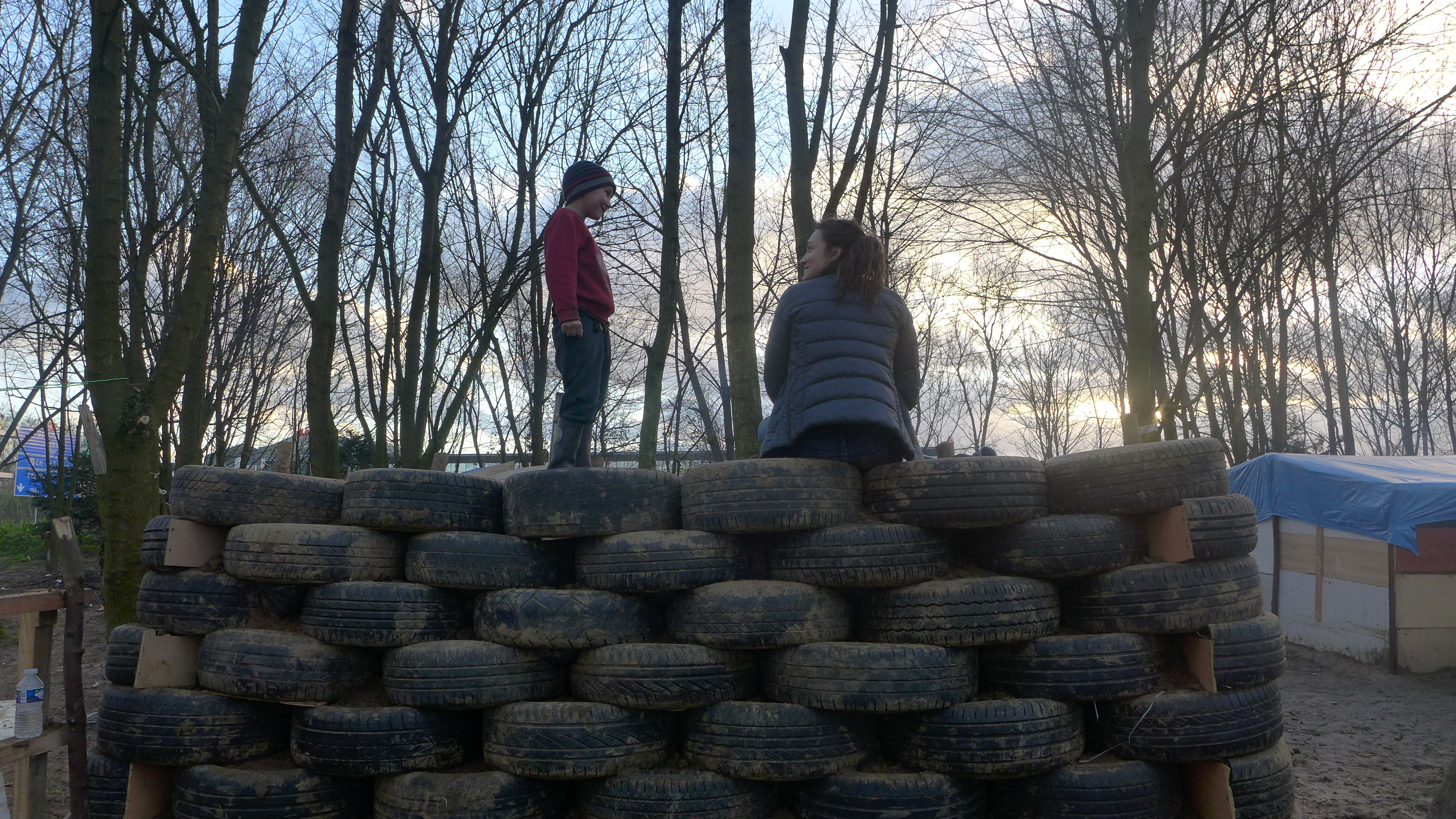 Matériaux utilisés (récupérés) : pneus, poutre en bois non traité, poteaux en bois traité, portes-fenêtres et double-vitrage, palettes (sol et façades), planches, mobilier pour enfants (Emmaüs), bâche publicitaire, branchage, tapis, bidon et cheminée, panneaux de dibond.