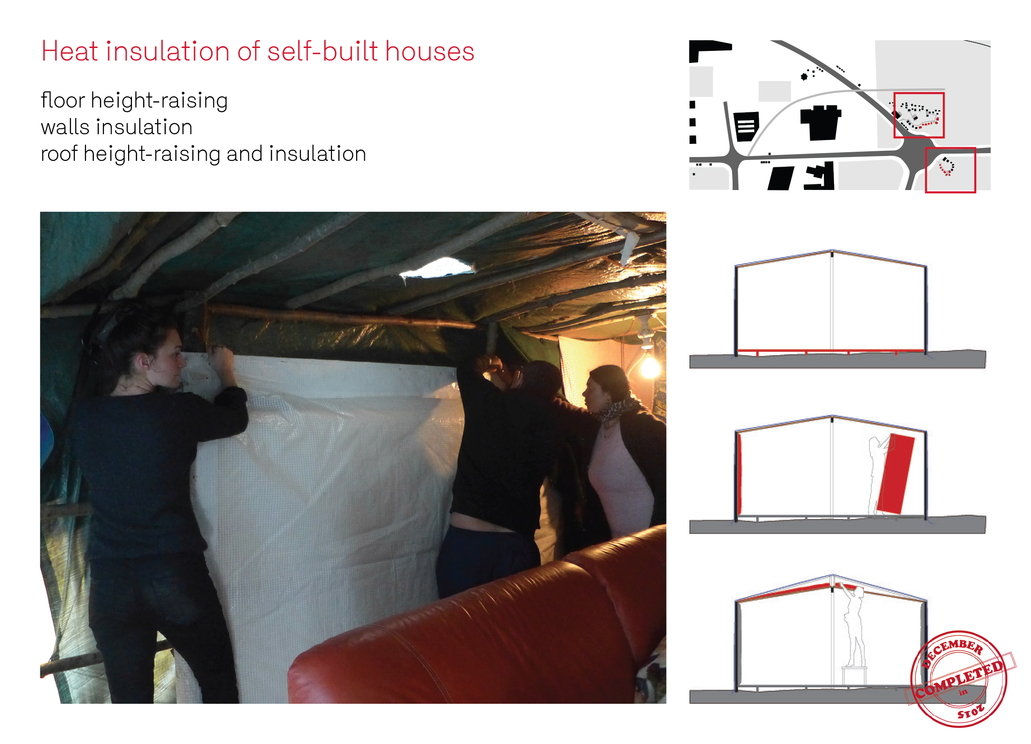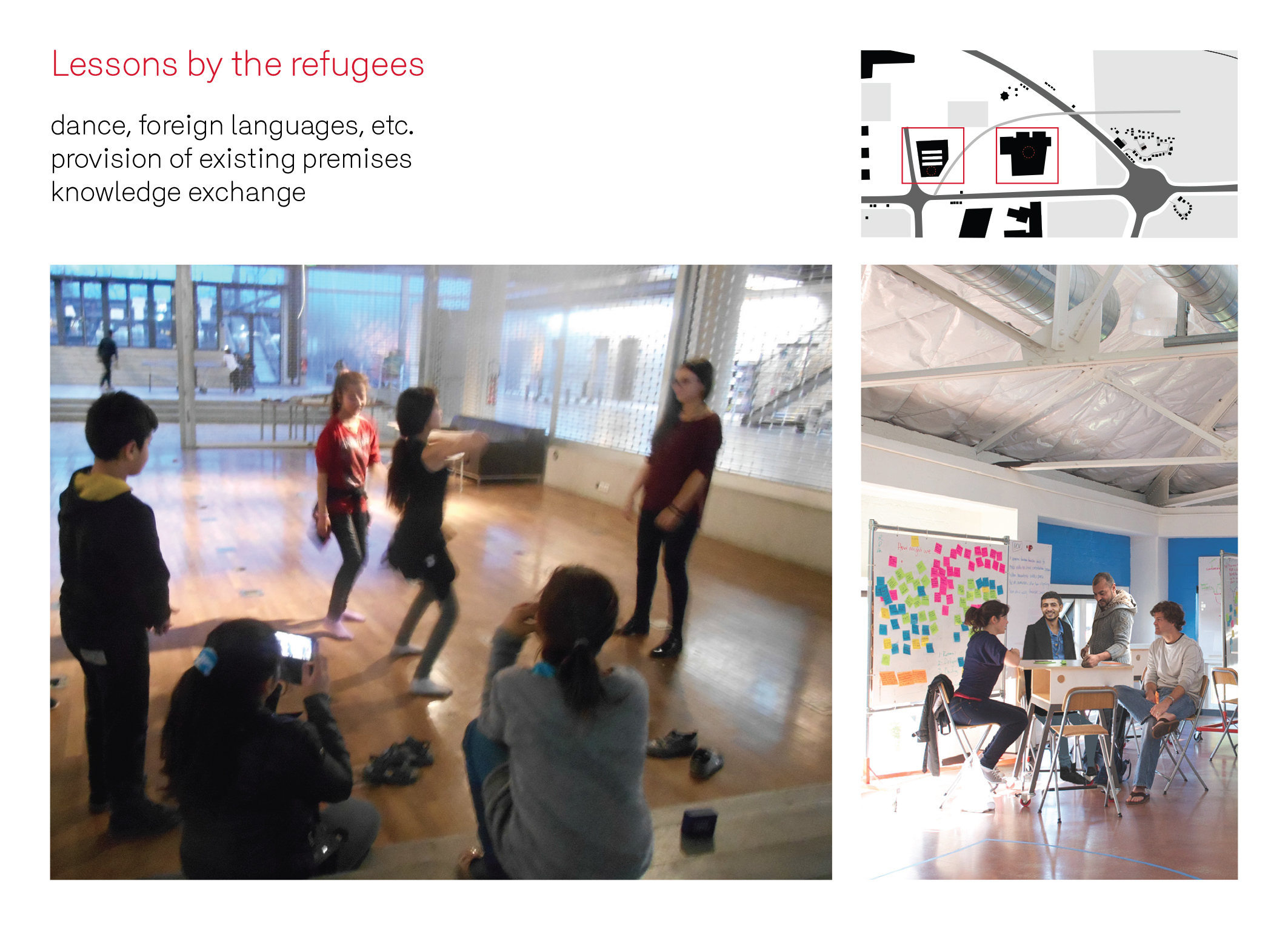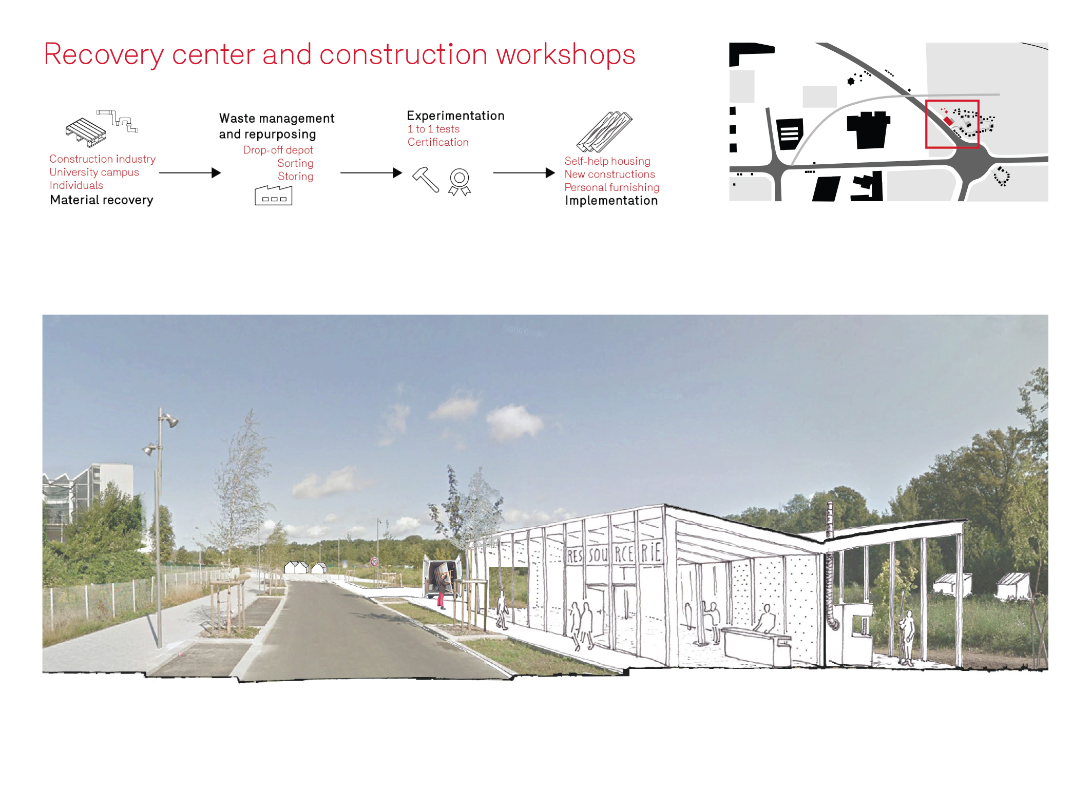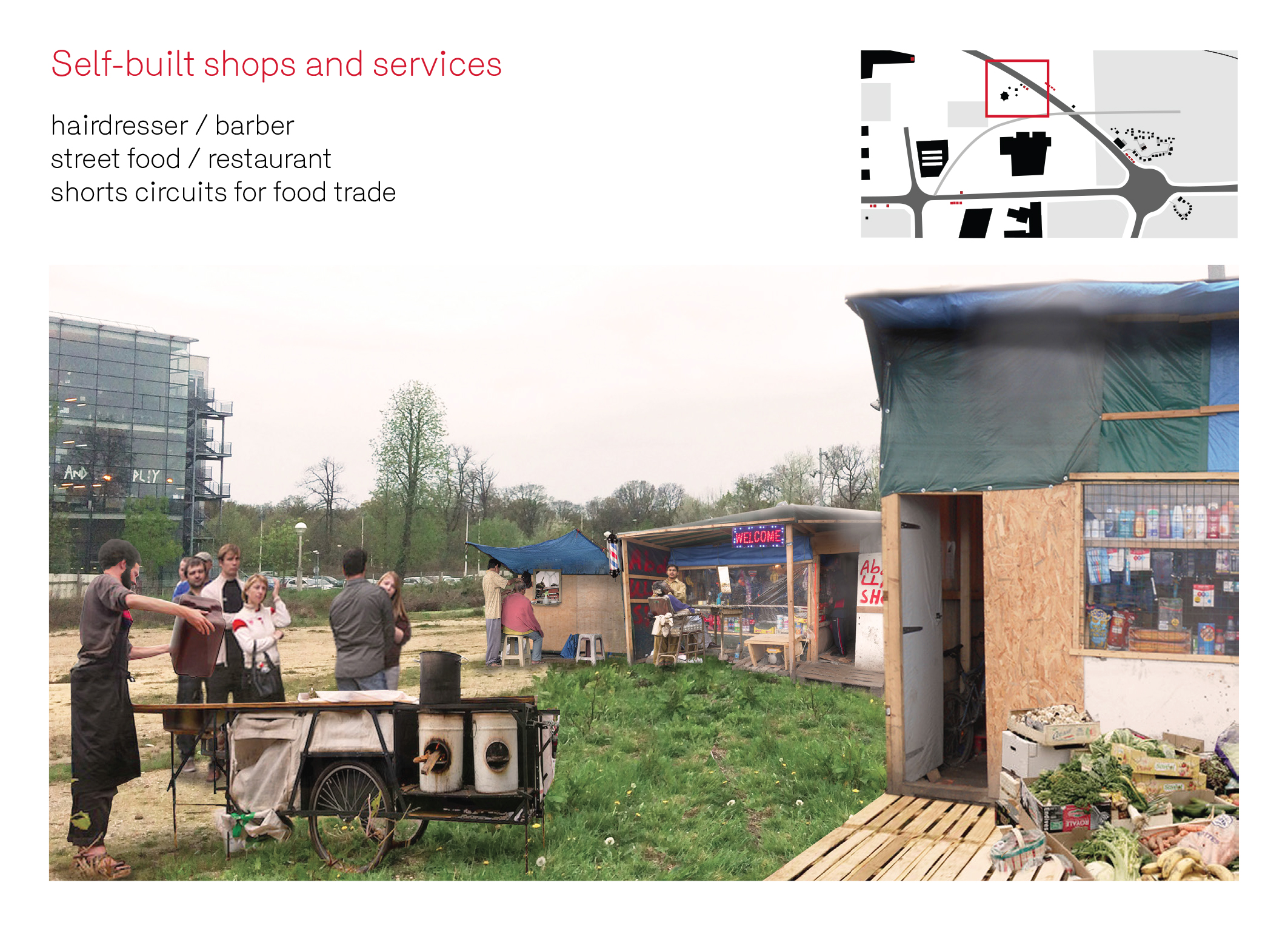 A Champs-sur-Marne (77, France) notre projet-action est pensé pour l’accueil de réfugiés Roms installés en sous-bois à proximité du campus universitaire Paris-Est. Pour aider ces réfugiés à s’installer, nous travaillons à conforter les espaces collectifs, à rendre le sol et les accès praticables en toute saison, à créer des lieux de préscolarisation et des abris pour le travail. La planification de plusieurs ZAC sur le territoire rend possible l’occupation à moyen terme de ces territoires en attente. Au périmètre, les programmes d’utilité réciproques sont encouragés pour permettre la porosité entre le quartier auto-construit et la ville (ressourcerie, commerces, services, etc.). Ces hypothèses intéressent aujourd’hui le campus qui cherche son devenir dans une vision moins monofonctionnelle, plus durable et plus sociale de la ville.